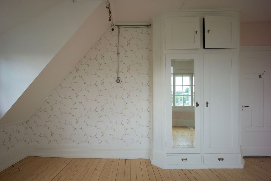 und im ersten Stock Schlafräume in einer lichten, freundlichen Farbwelt. Die bereits grossteils weiss gehaltenen Bedienstetenzimmer unter dem Dach, werden zu Kinderzimmern in zarten, frischen Farben welche, in Kombination mit blumigen Tapeten, neu erblühen.
